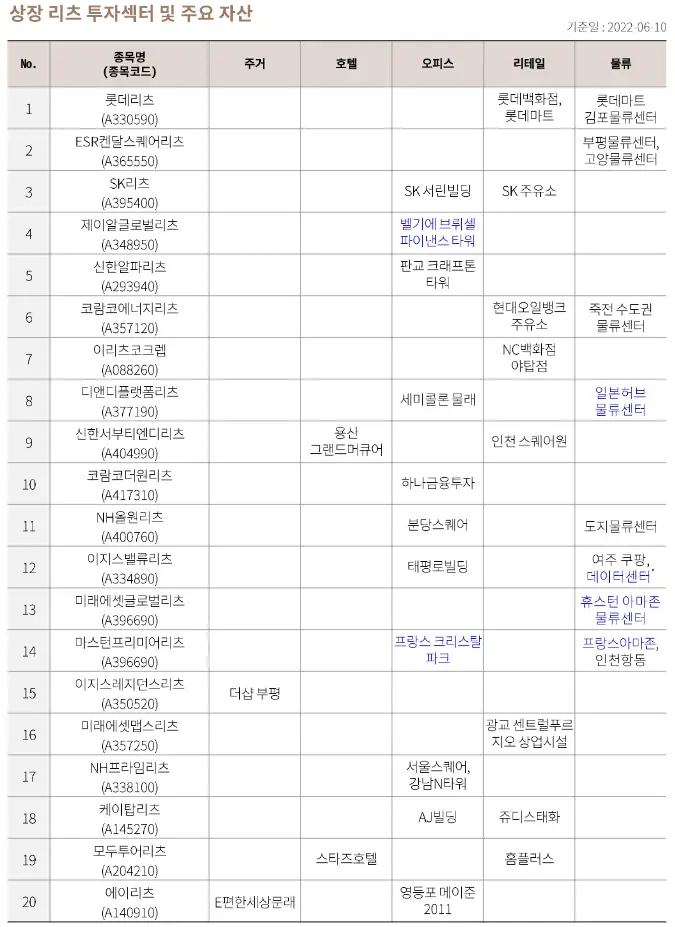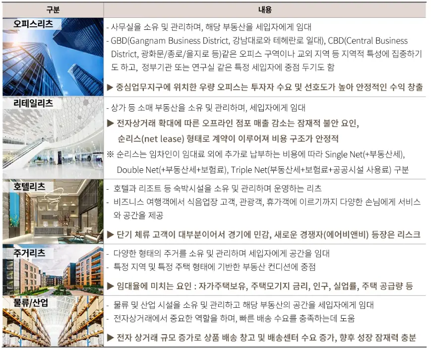 리츠는 기초자산의 유형에 따라 오피스 리츠, 리테일 리츠, 호텔 리츠, 주거 리츠, 물류/산업 리츠와 다양한 유형의 부동산을 편입하는 복합 리츠로 구분할 수 있습니다. 미국에서는 데이터센터, 헬스케어, 인프라 등 기초자산의 유형을 좀 더 세분화하고 다양하게 구분하고 있습니다.